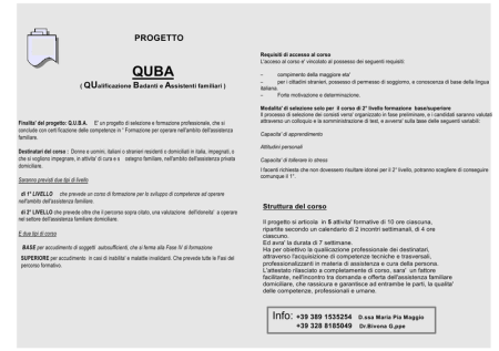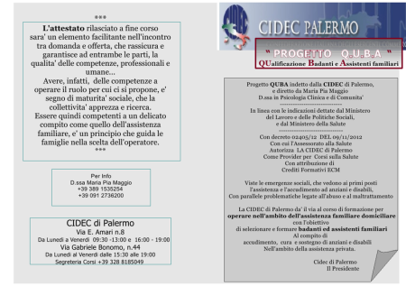 LA QUALIFICAZIONE CHE LA CIDEC SI PROPONE ATTRAVERSO PERSONALE QUALIFICATO DI PSICOLOGO -GERIATRA-ASSISTENTI E INFERMIERI PROFESSIONALI - CONSULENTE LEGALE ,e , DI FORMARE PERSONALE DI BADANTI ED ASSISTENTI PER ANZIANI ATTRAVERSO LA COLLABORAZIONE E DIREZIONE DEL PROGETTO DELLA DOTTORESSA MARIA PIA MAGGIO SPECIALIZZATA IN PSCOLOGIA CLINICA E DI COMUNITA .